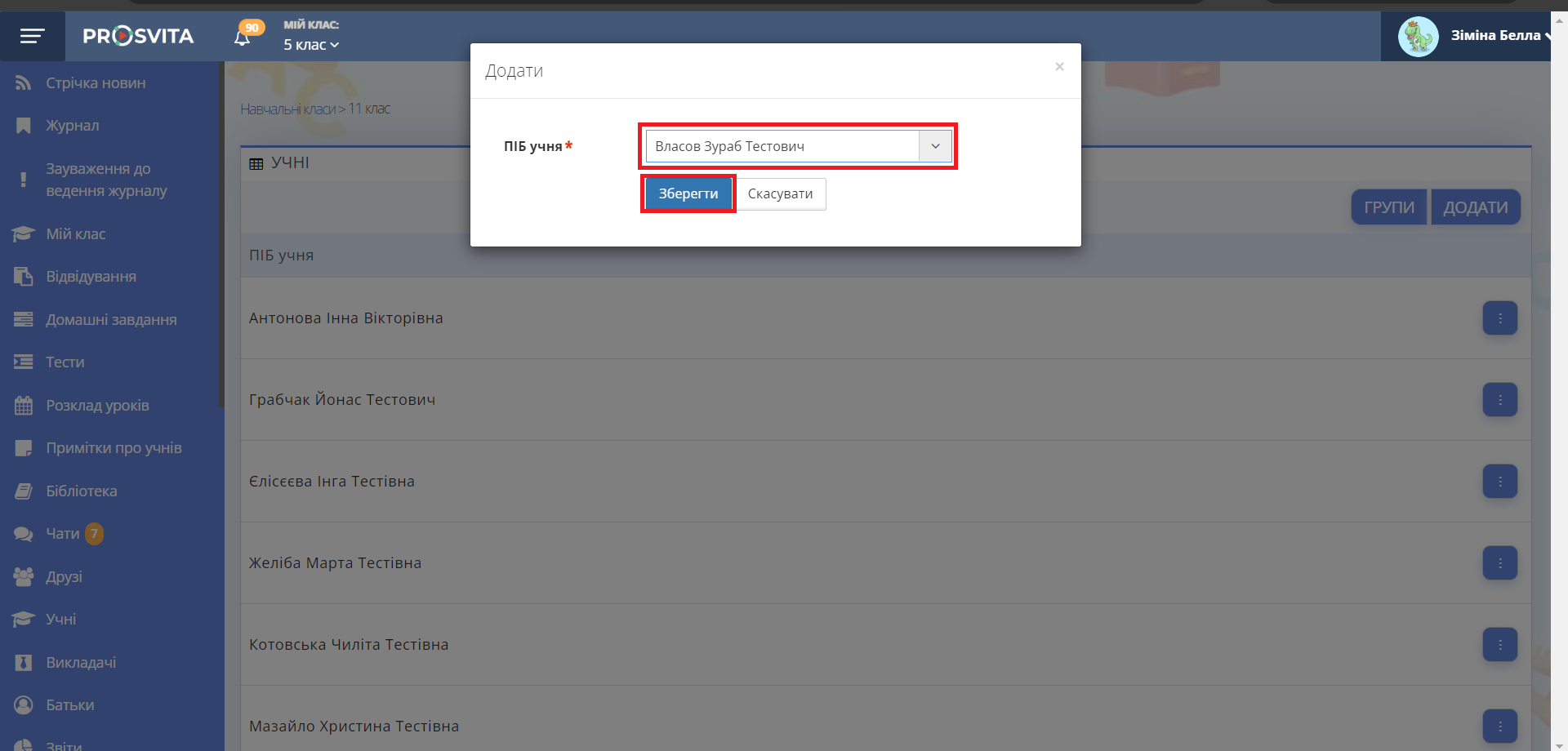 У вікні введіть прізвище учня, оберіть його зі списку та натисніть Зберегти.