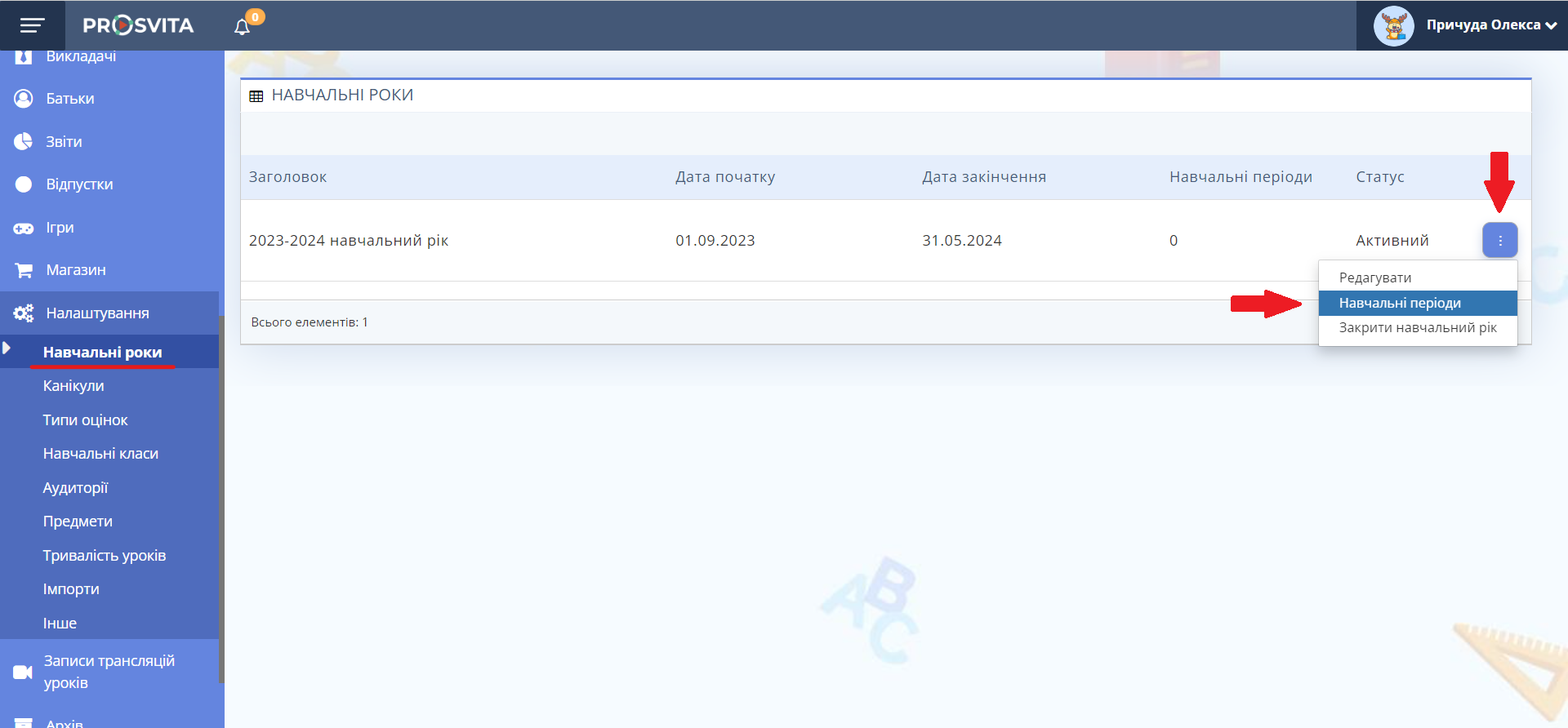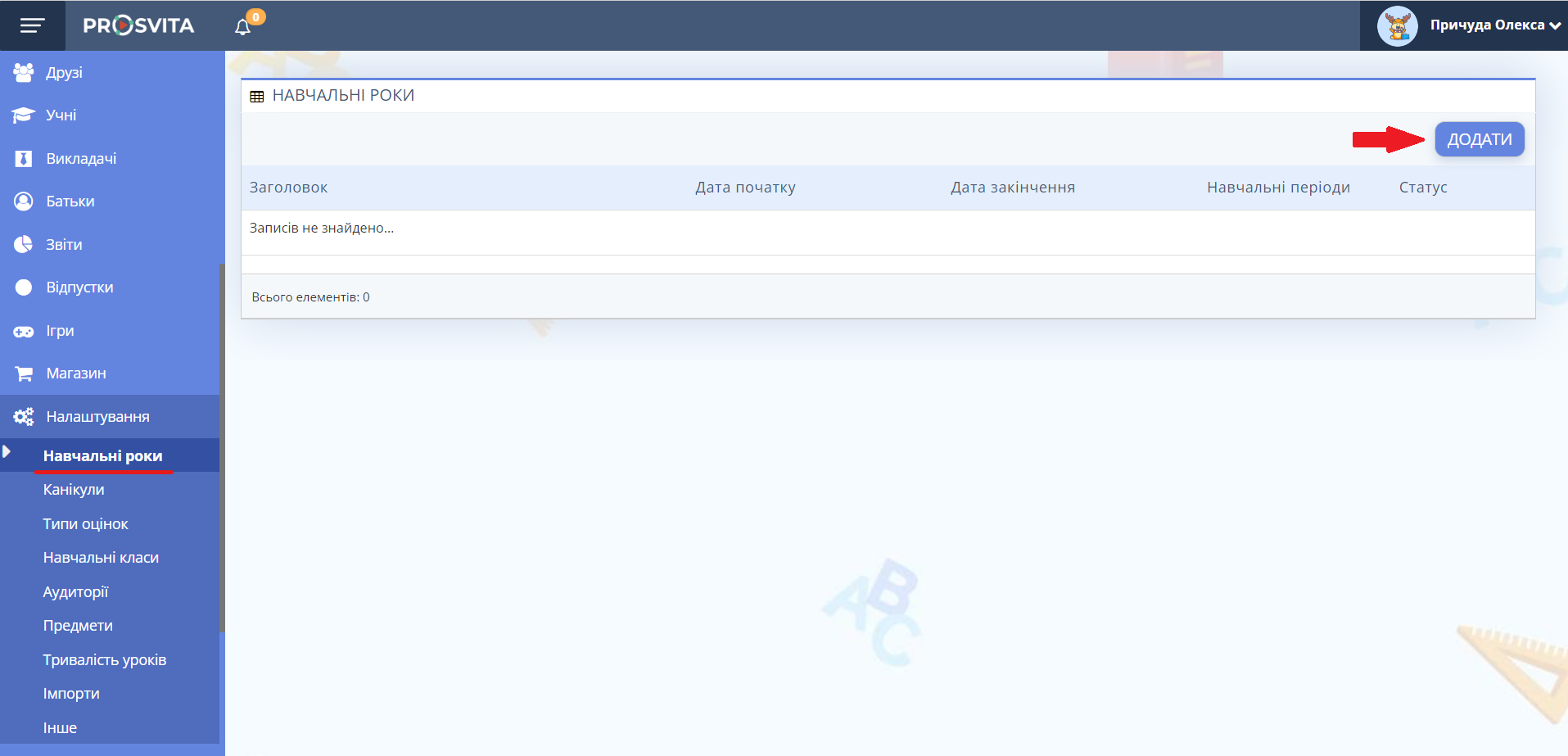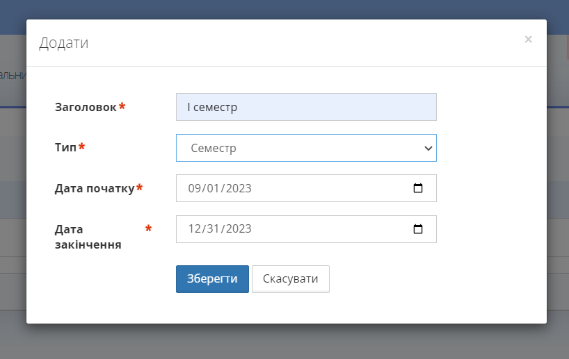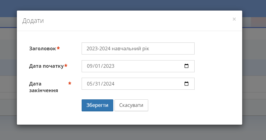 Введіть назву навчального року та встановіть початок і кінець періоду. Натисніть Зберегти.