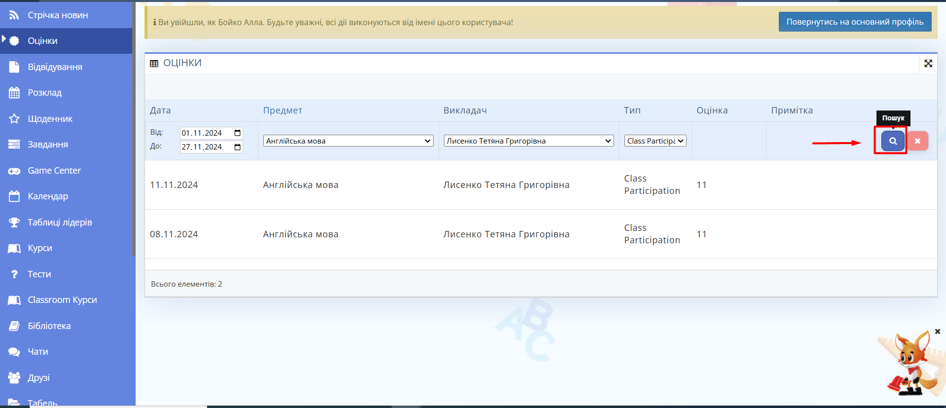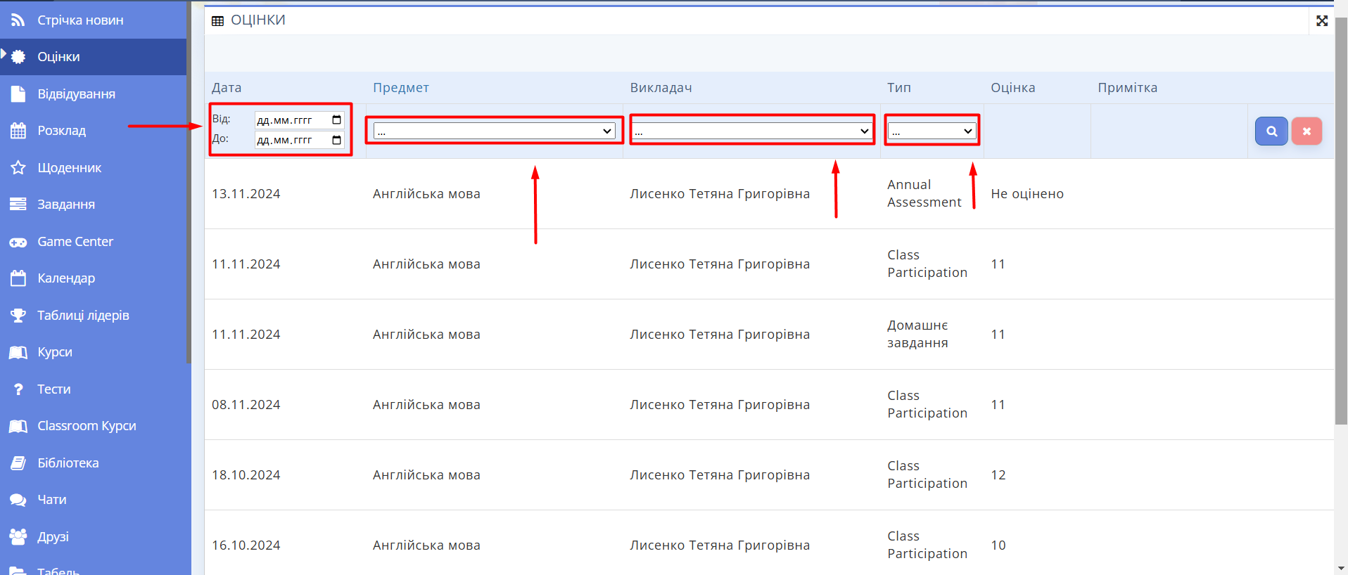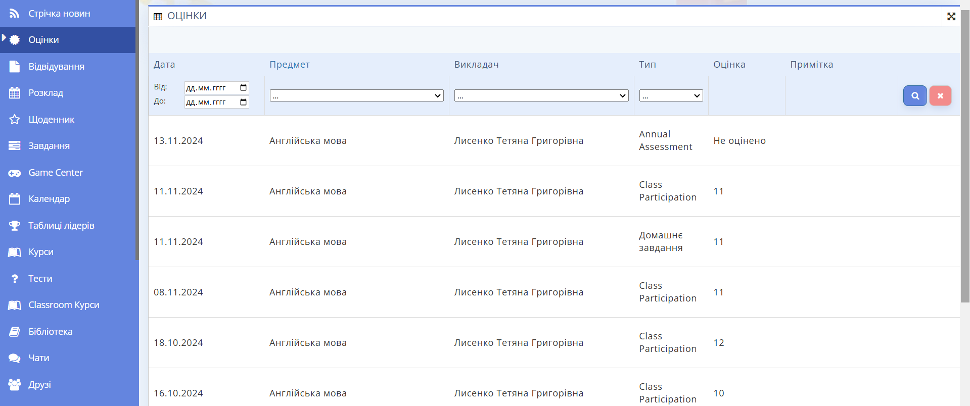 Оберіть пункт меню "Оцінки". Рис. 1 — Список оцінок