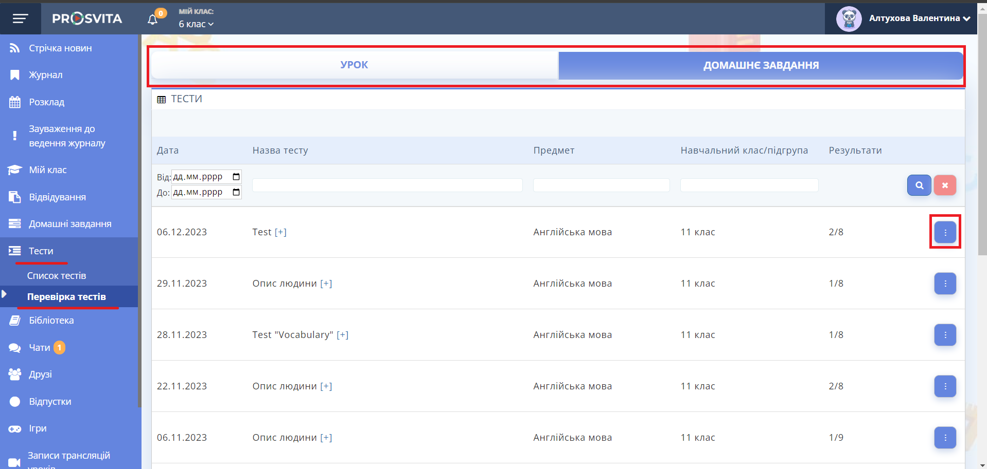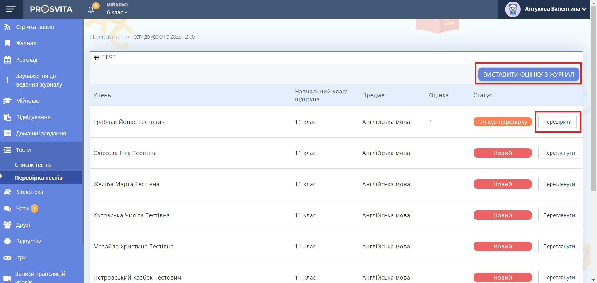 7. У вікні зі списком учнів оберіть тест для перевірки і натисніть "Перевірити".