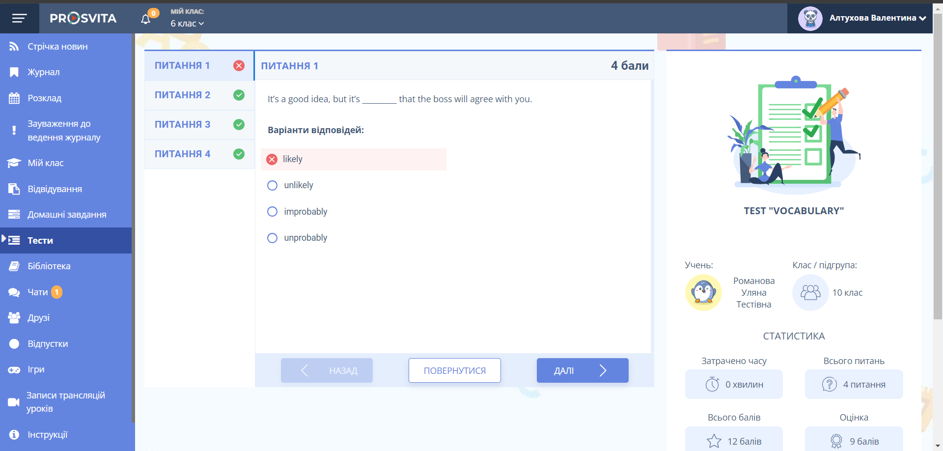 9. Перевірте відповіді учнів на сторінці перевірки тестів.