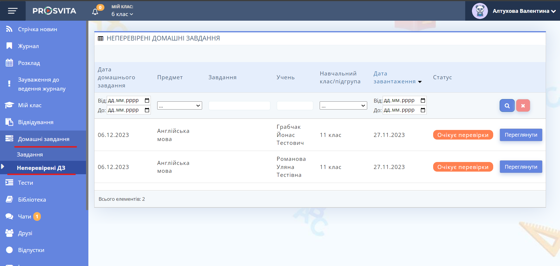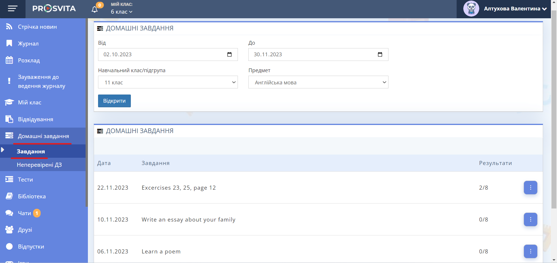 Розділ складається з двох сторінок: "Завдання" та "Неперевірені ДЗ".