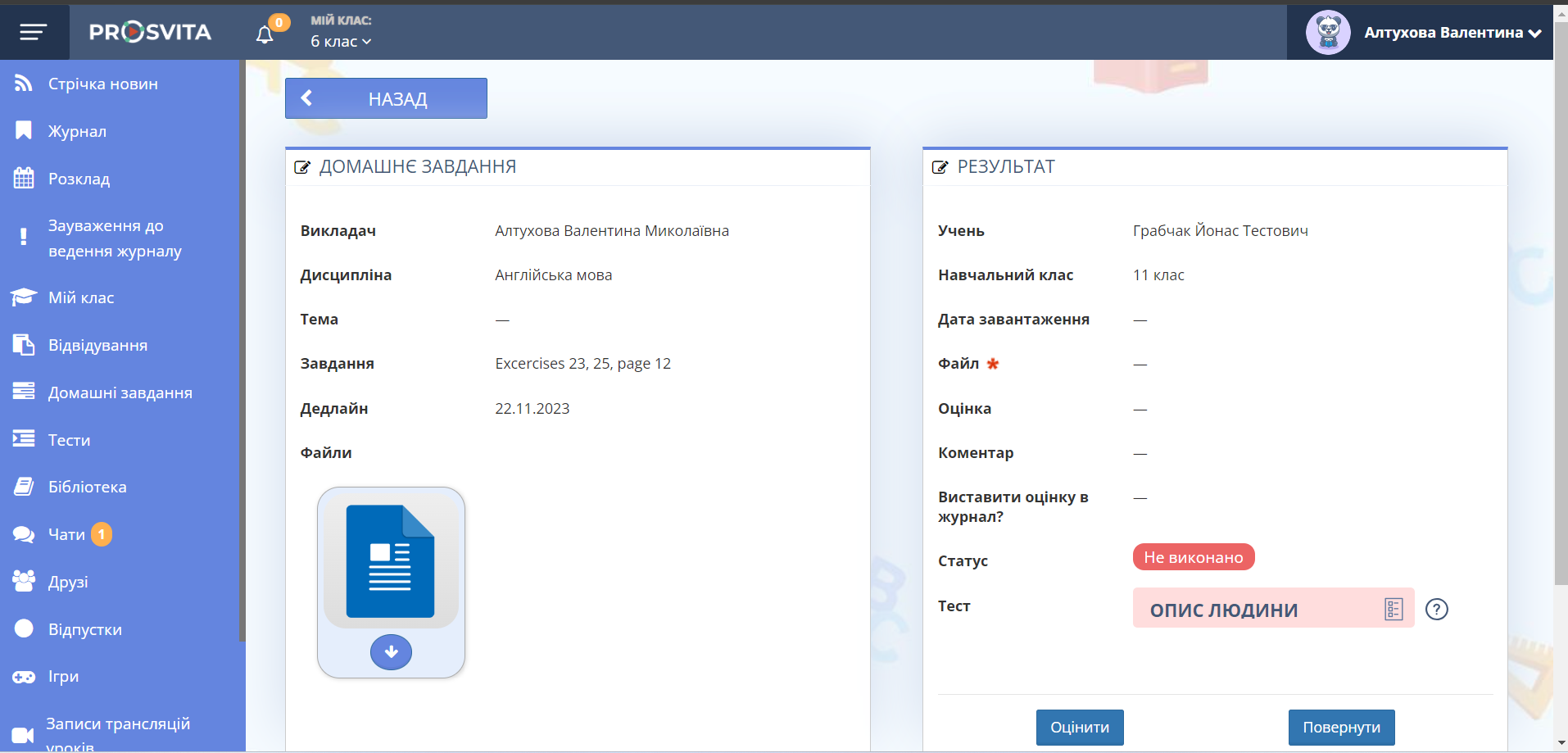 Рис. 10. Перевірка тесту через Розділ "Домашні завдання"