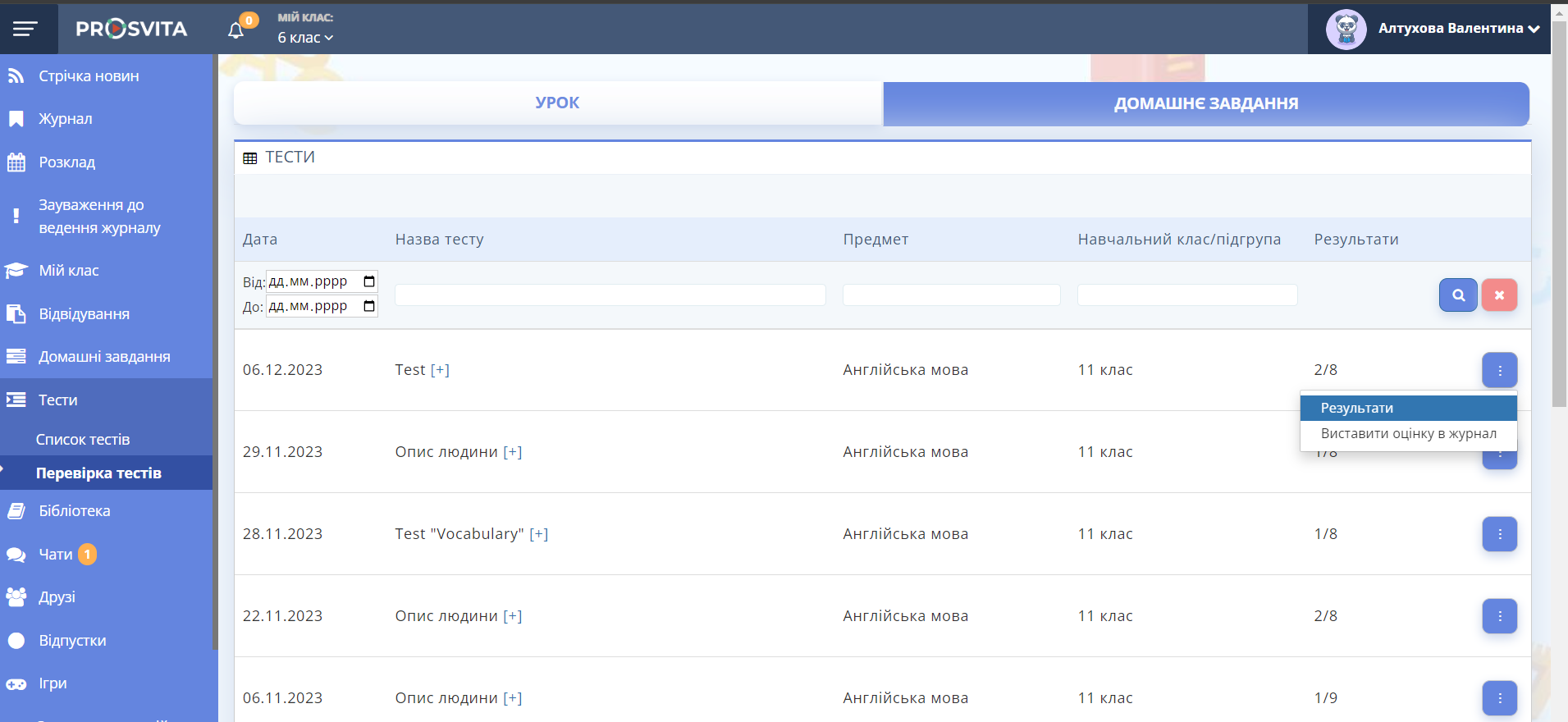 2. Використайте фільтри за датою, предметом, завданням, учнем і класом.
