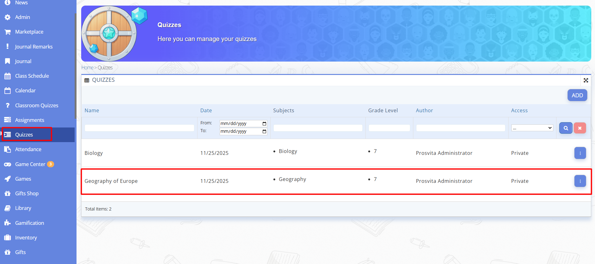 Fig. 1. View of the “Quizzes” page