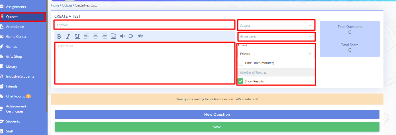 - Fill in the Quiz creation form: