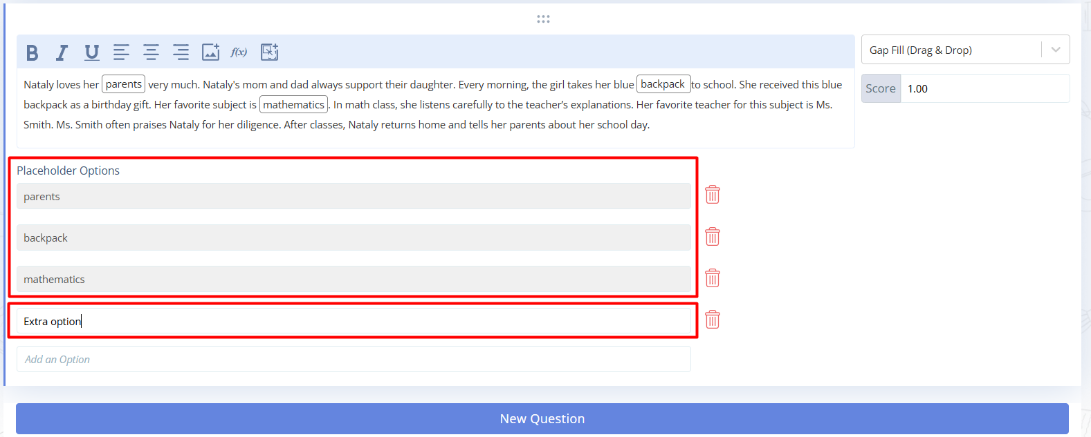 Gap Fill (input) is a text where some words or phrases are hidden and the student types them manually.
