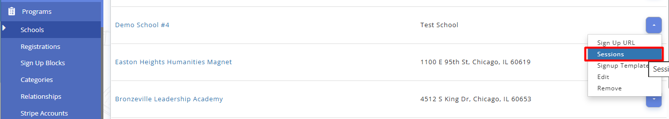Manage Session Actions: Each Session in the list can be edited or removed. Additionally, you can access the School Programs page by clicking the 'Programs' option in the actions menu.
