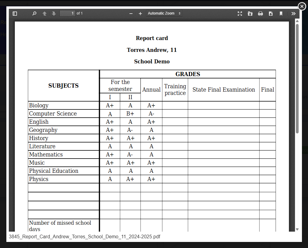 A report card is a PDF document that summarizes a student’s grades for a selected academic year or term.
