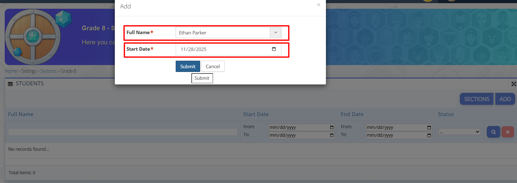 In the pop-up, enter the student’s last name, select them from the list, choose “Start Date” and click “Save”.