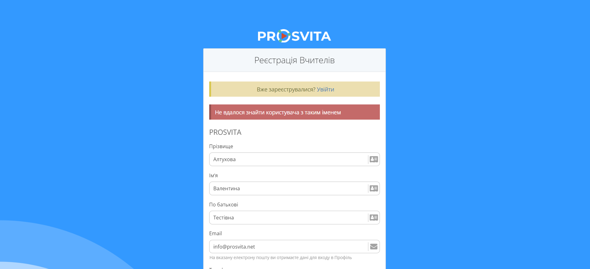 Якщо з'явилася помилка "Не вдалося знайти користувача з таким іменем", перевірте правильність введення ПІБ.