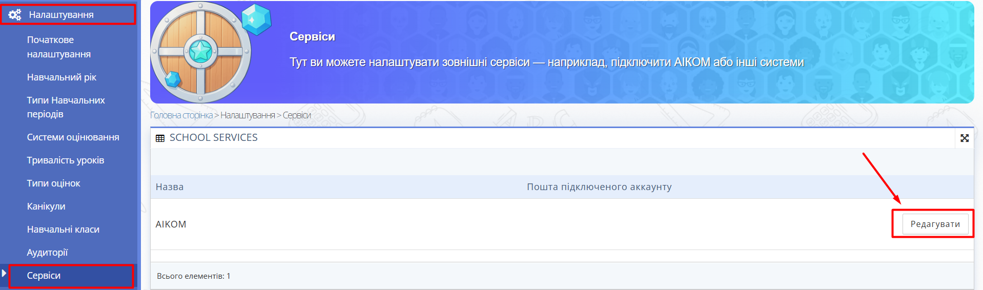 Рис. 2. Вкладка "Сервіси"* - Переконайтеся, що відображається рядок з сервісом AIKOM. Натисніть кнопку "Редагувати".