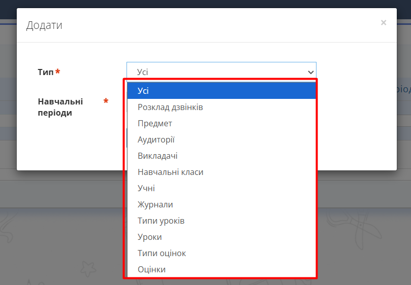 Рис. 5. Фільтр розділів для синхронізації з AIKOM* - Оберіть Навчальні періоди для синхронізації.