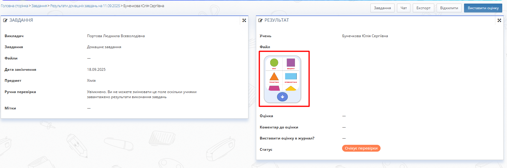 - Введіть параметри у поля фільтрів: дата, викладач, предмет, завдання, клас, дата завантаження, статус "Очікує перевірки".