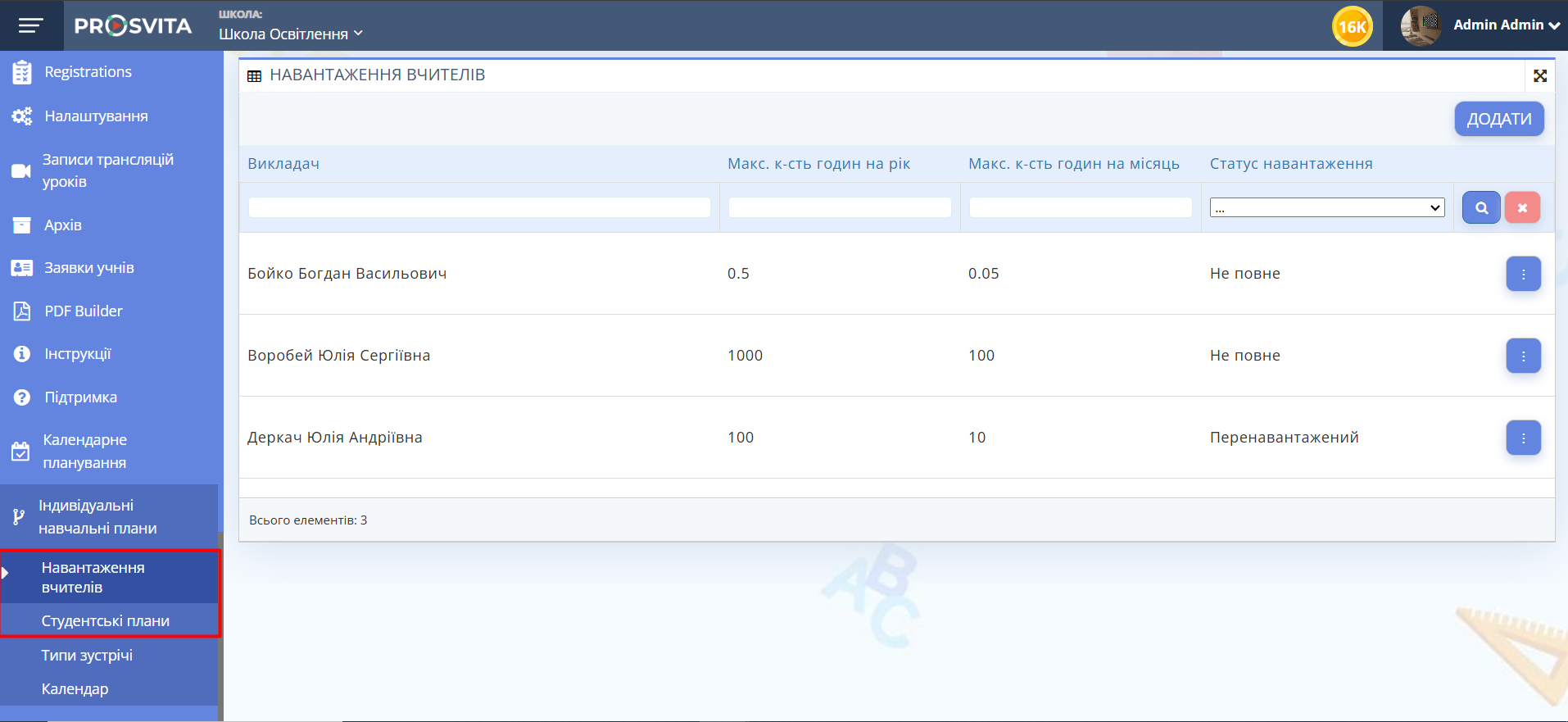 Оберіть пункт меню "Індивідуальні навчальні плани" -> "Навантаження вчителів".