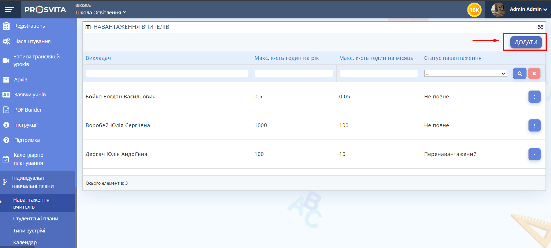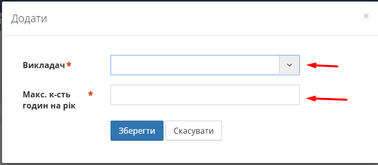 Заповніть форму: введіть ПІБ вчителя та максимальну кількість годин на рік для занять з учнями індивідуальної форми навчання. Натисніть кнопку "Зберегти".