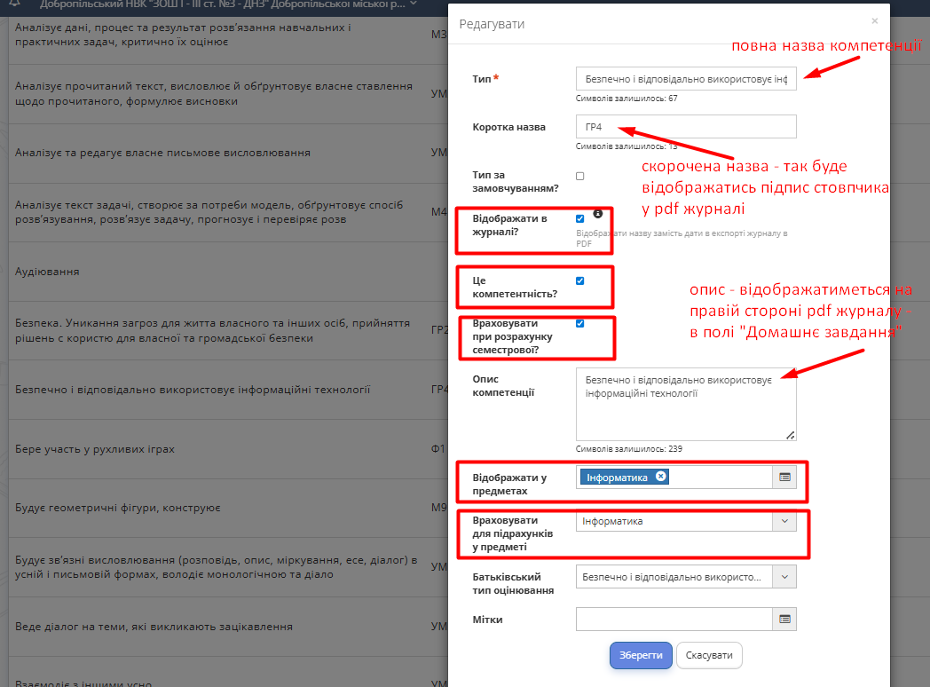 Додайте опис компетенції, а також вкажіть предмети, в межах яких застосовується компетенція. За потреби в кінці назначте мітки.