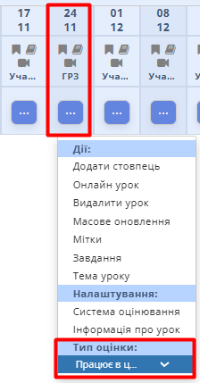 Після налаштувань адміністрацією закладу тип оцінювання з’явиться в загальному переліку. Викладач відкриває журнал потрібного класу, предмету, періоду і обирає відповідний тип оцінювання.