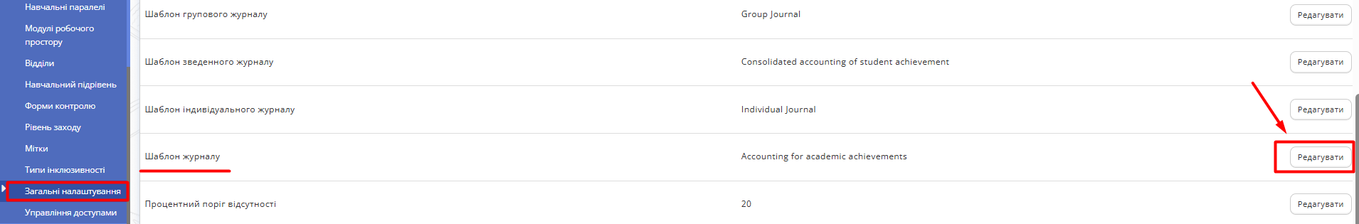 Рис. 6 — Редагування шаблону журналу - У вікні Редагувати: Шаблон журналу виберіть потрібний варіант і натисніть Зберегти.