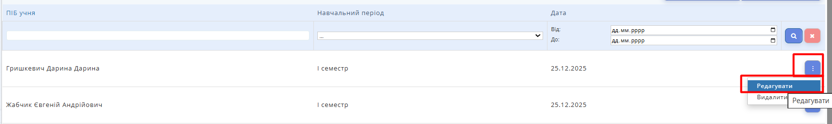 У «Звіти» → «Реєстрація вступного інструктажу» можна переглянути зведений список учнів, яким призначено вступний інструктаж.