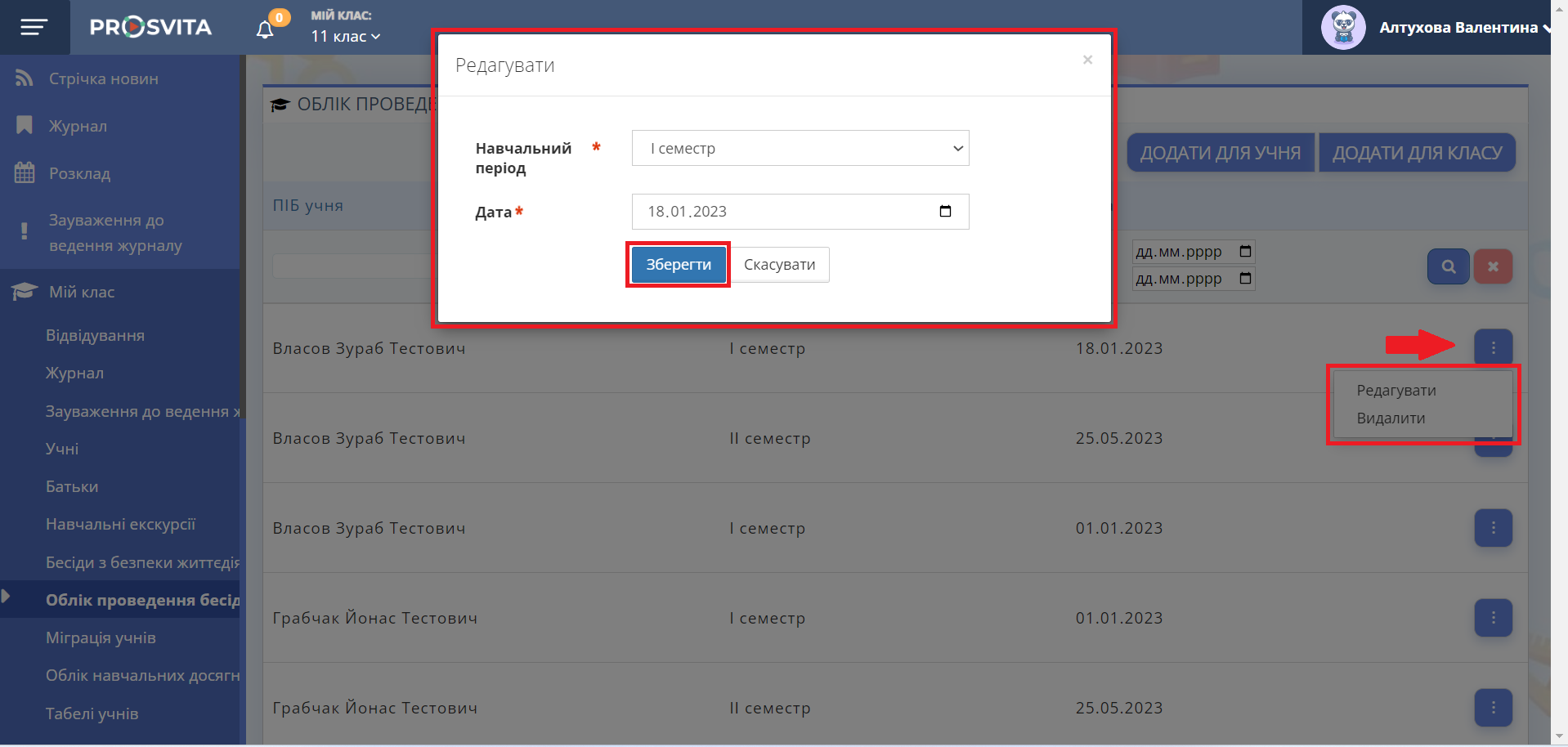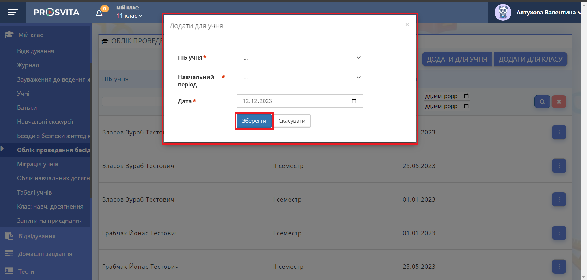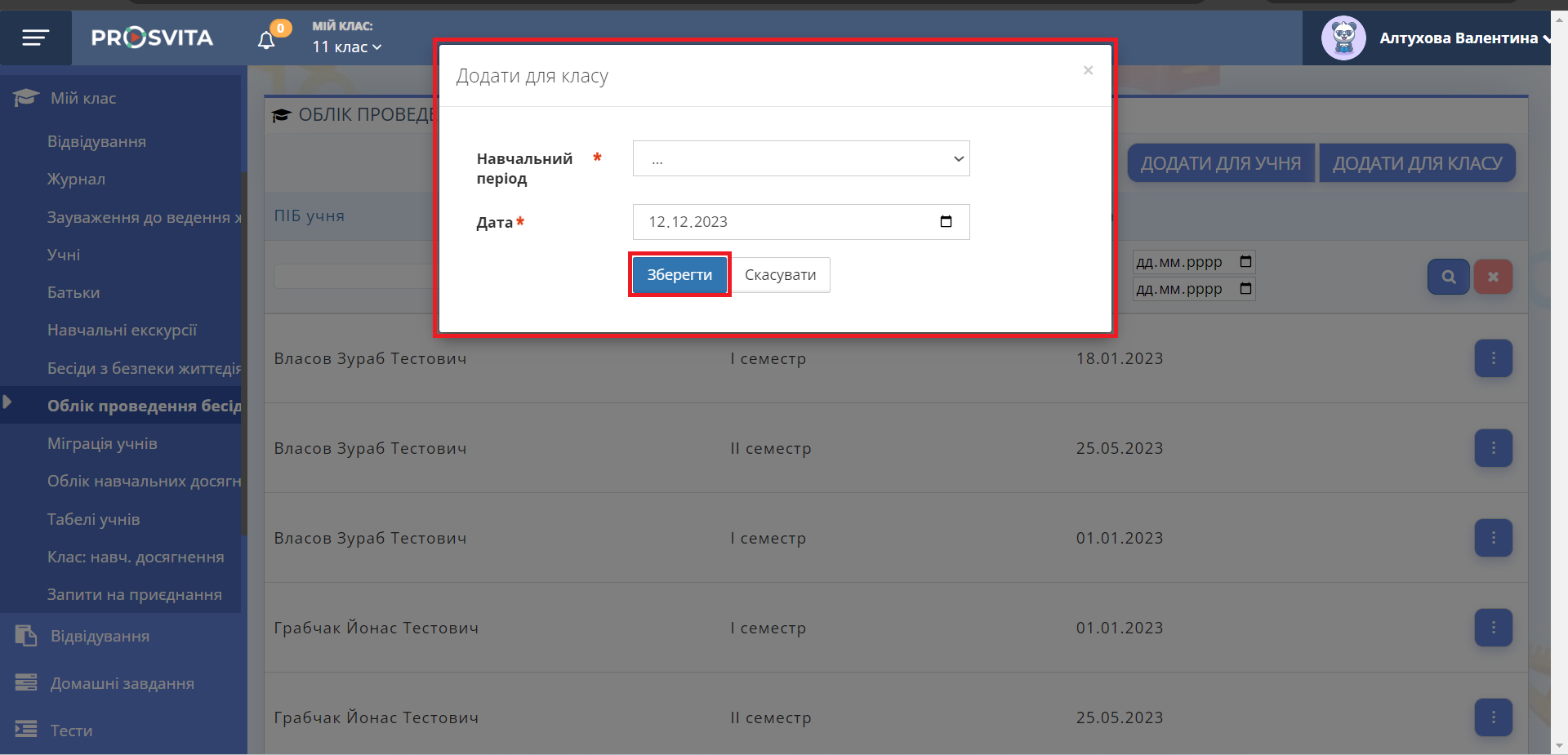 Рис. 3. Додати бесіду/інструктаж для класу - Натисніть кнопку "Зберегти", щоб додати запис.