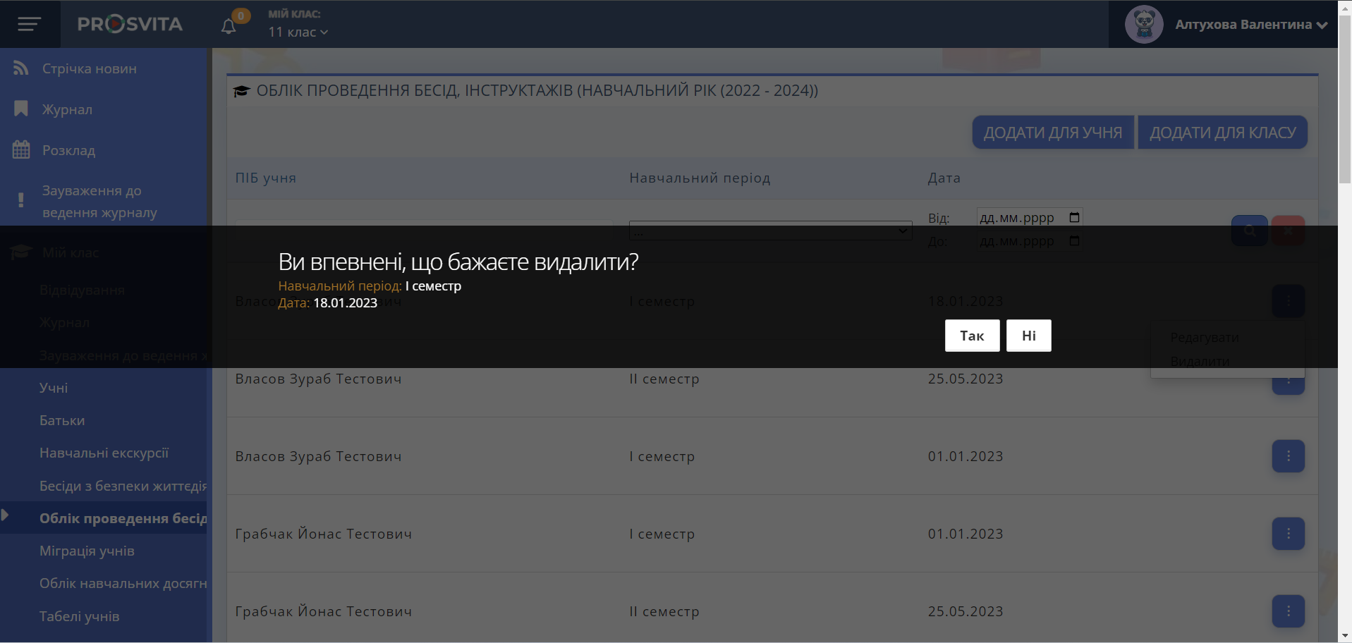 - Заповніть у вікні навчальний період та дату інструктажу або бесіди.