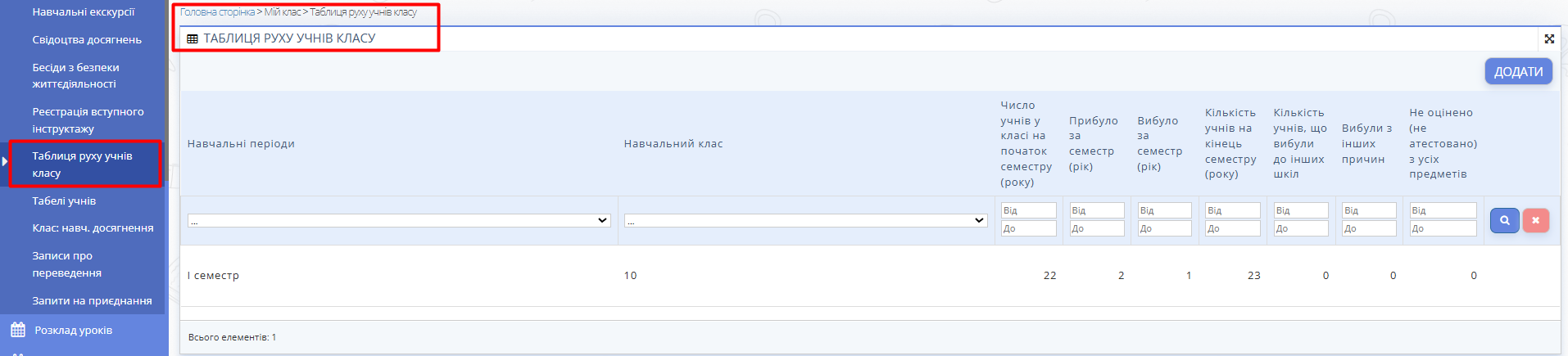 Рис. 1. Сторінка "Таблиця руху учнів класу" -