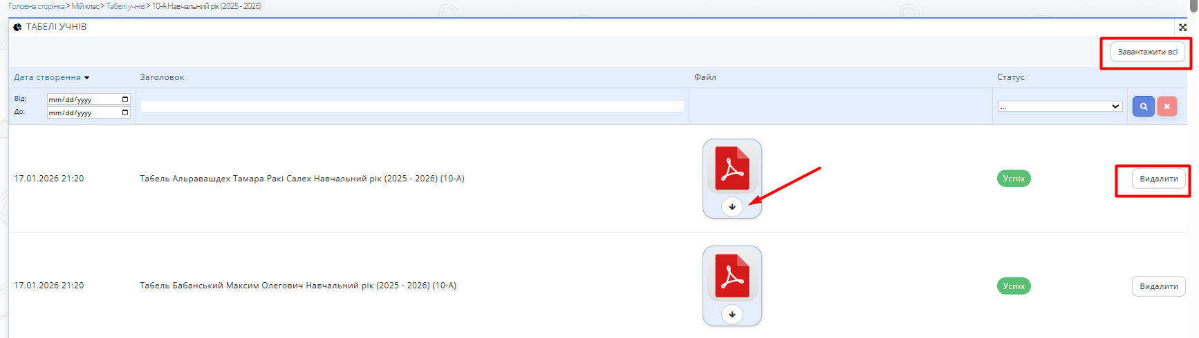 Рис. 3. Видалення усіх сформованих табелів зі списку - Для завантаження всіх табелів одночасно натисніть кнопку "Завантажити всі" у верхній частині сторінки.