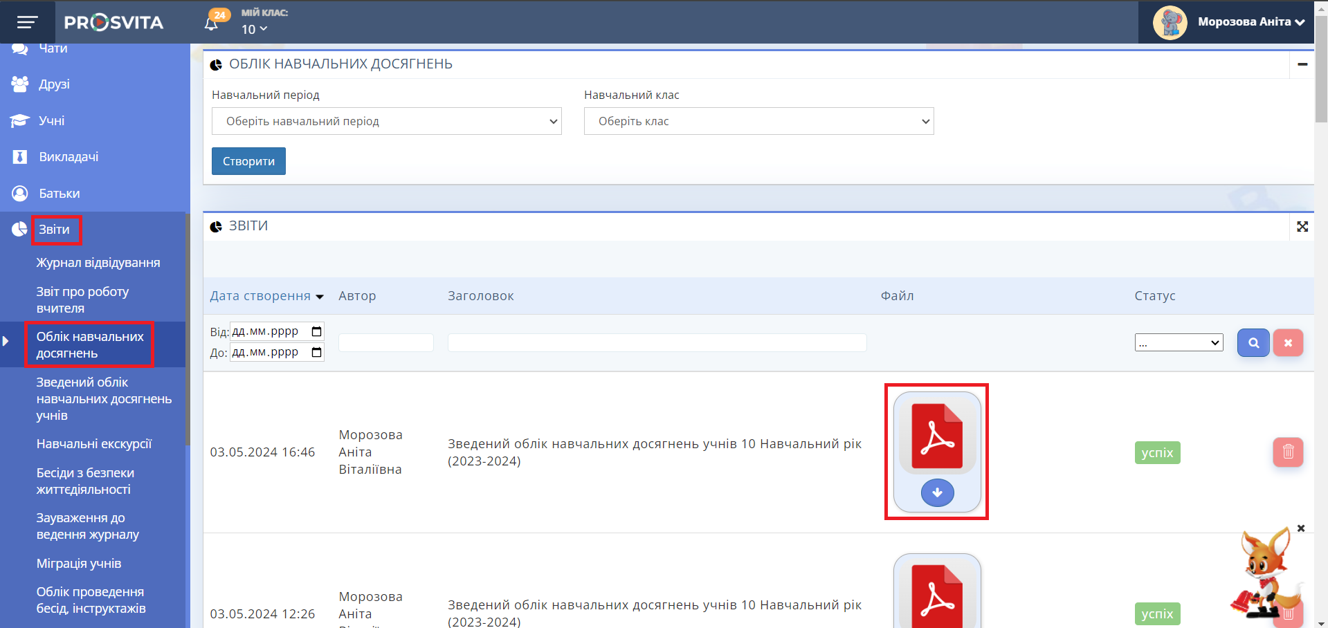 Також вся інформація відображатиметься в Журналі класу. Для цього Адміністратору потрібно перейти у Розділ "Звіти" → "Облік навчальних досягнень" → обрати відповідний клас та період → кнопка "Створити" → відкрити завантажений журнал класу (Рис. 4).