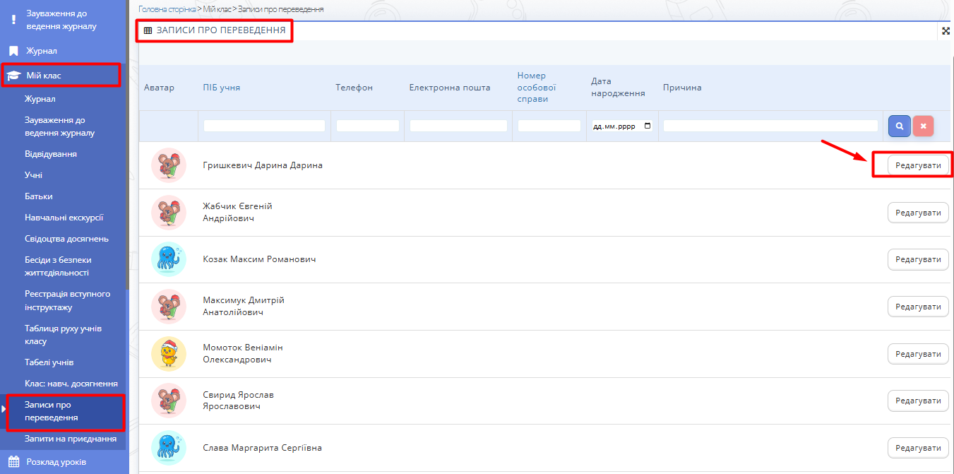 Перед закриттям навчального року Вчитель має внести записи про переведення учнів до наступного класу. Для цього він повинен перейти у Розділ "Мій клас" → "Записи про переведення", обрати відповідного учня та натиснути на кнопку "Редагувати" праворуч від ПІБ учня (Рис. 1).