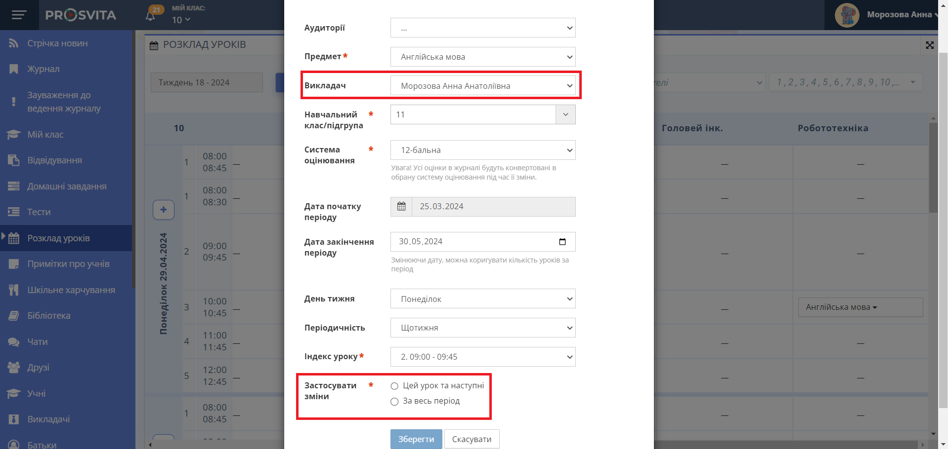 У формі перевірте, чи в пункті "Викладач" стоїть новий вчитель. Якщо ні, оберіть потрібного вчителя. Натисніть "Застосувати зміни: Цей урок та наступні".