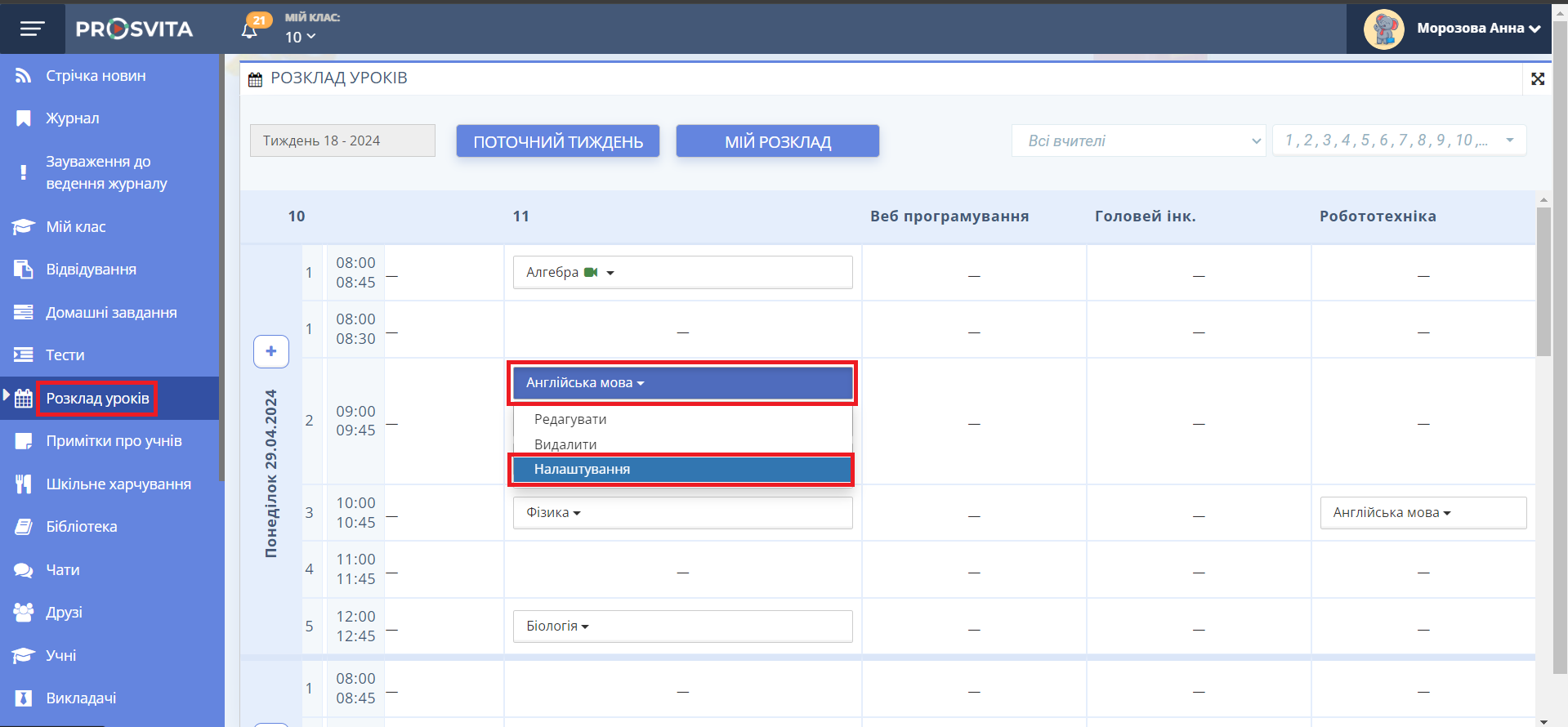 - Перевірте вчителів у Розкладі та Журналі. Якщо були заміни викладачів, перевірте у розділі "Розклад уроків", чи правильно внесені дати зміни вчителя. Знайдіть урок із заміною. Оберіть опцію "Налаштування".