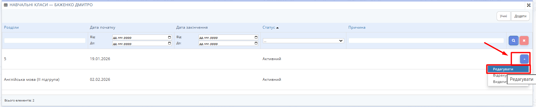 Рис. 2. Список класів і підгруп учня2.3. Якщо дата вказана невірно, натисніть справа від класу чи підгрупи кнопку контекстного меню та оберіть опцію "Редагувати".