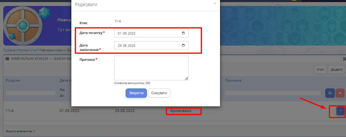 Рис. 4. Редагувати дату початку навчання2.5. Якщо потрібно відредагувати дати для учня, який вибув, редагуєте дату початку та дату закінчення навчання для учня у статусі "Архівовано" або "Видалено".
