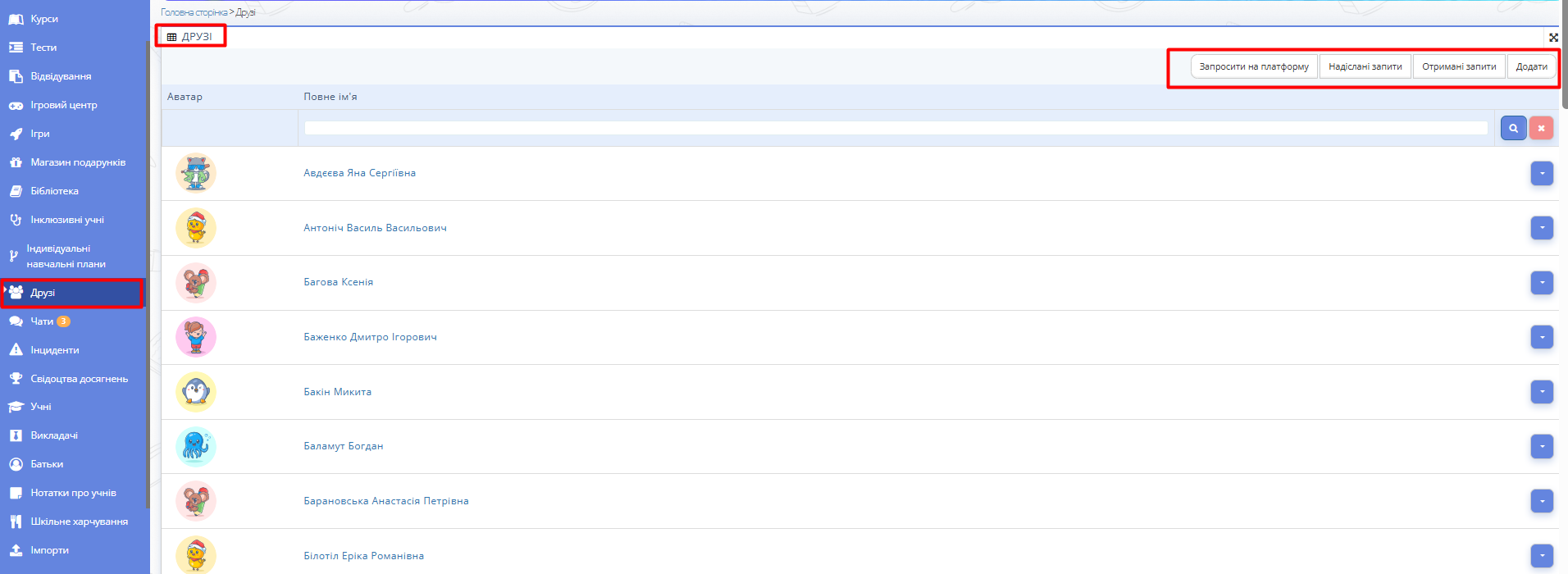 Рис. 1. Вигляд сторінки "Друзі" - Натисніть кнопку «Додати» у правому верхньому кутку.
