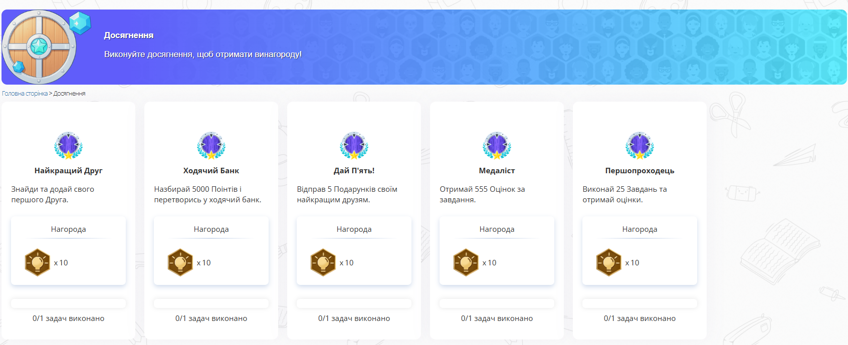 Розділ «Досягнення» відображає всі нагороди, які користувач може отримати за виконання квестів, завдань, активність або досягнення певних навчальних результатів.