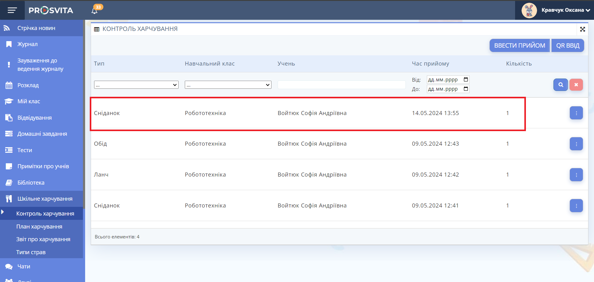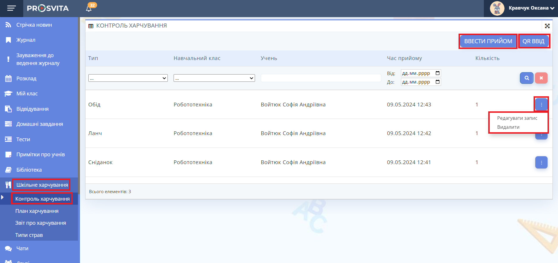 ⚠️ Для редагування інформації про прийоми харчування перейдіть у розділ "Шкільне харчування" -> "Контроль харчування".