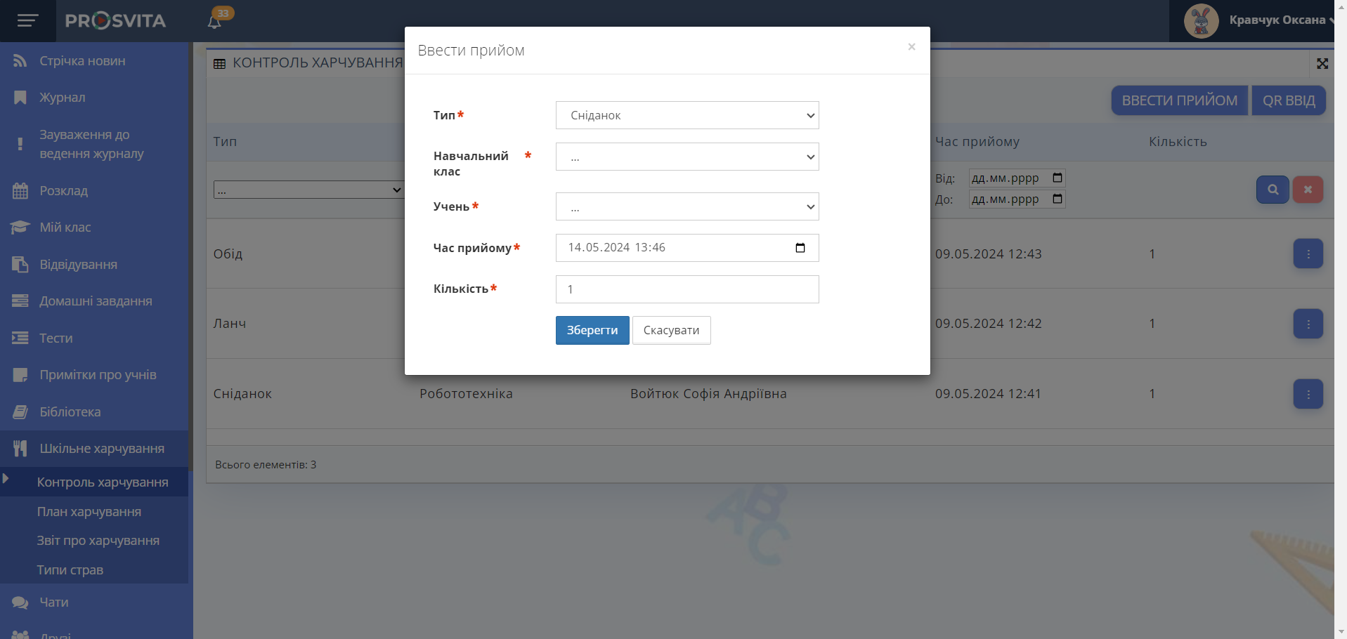 Заповніть тип прийому, клас, ПІБ учня, час прийому та кількість порцій.