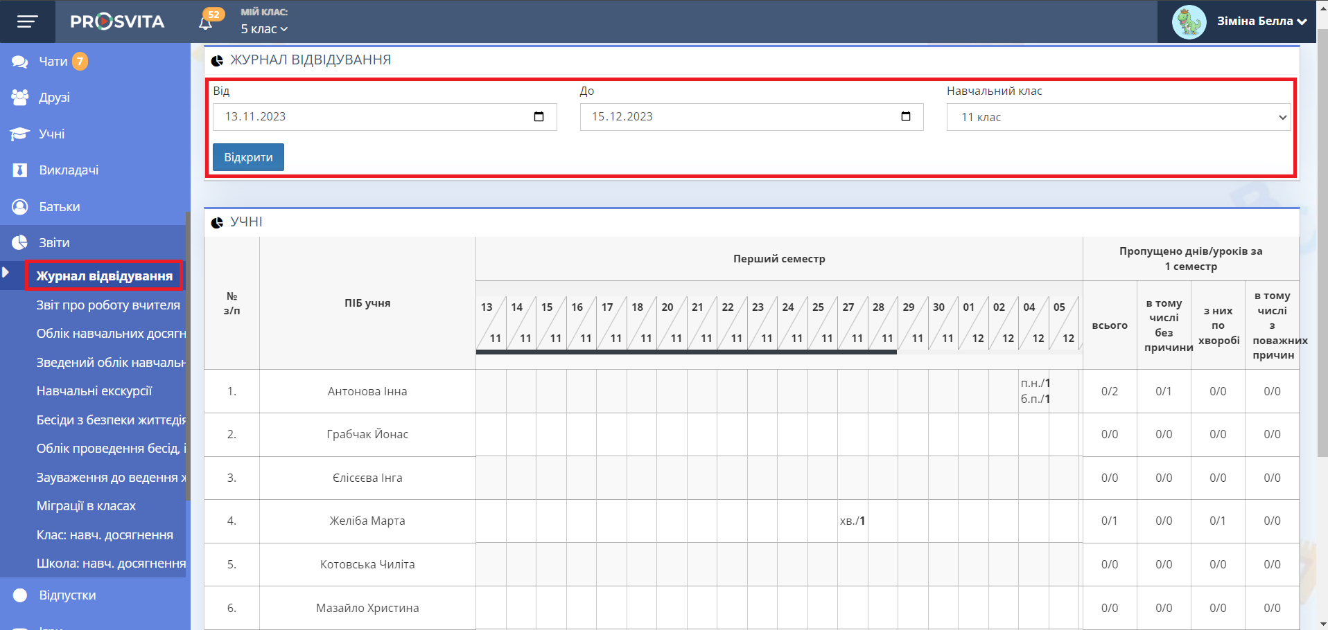 Рис. 1. Зовнішній вигляд сторінки "Журнал відвідування" - Перегляньте список учнів обраного класу за вибраний період з відмітками про відсутність та причинами.