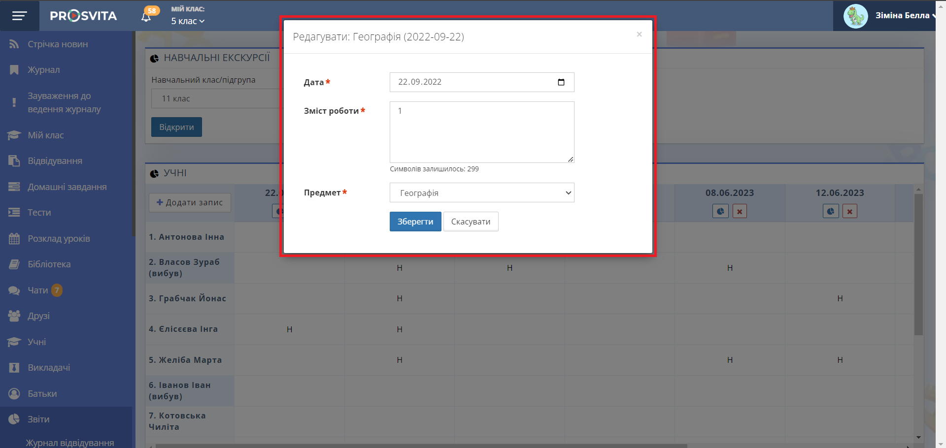 - Перегляньте список учнів, дати екскурсій та відсутність або присутність учнів.
