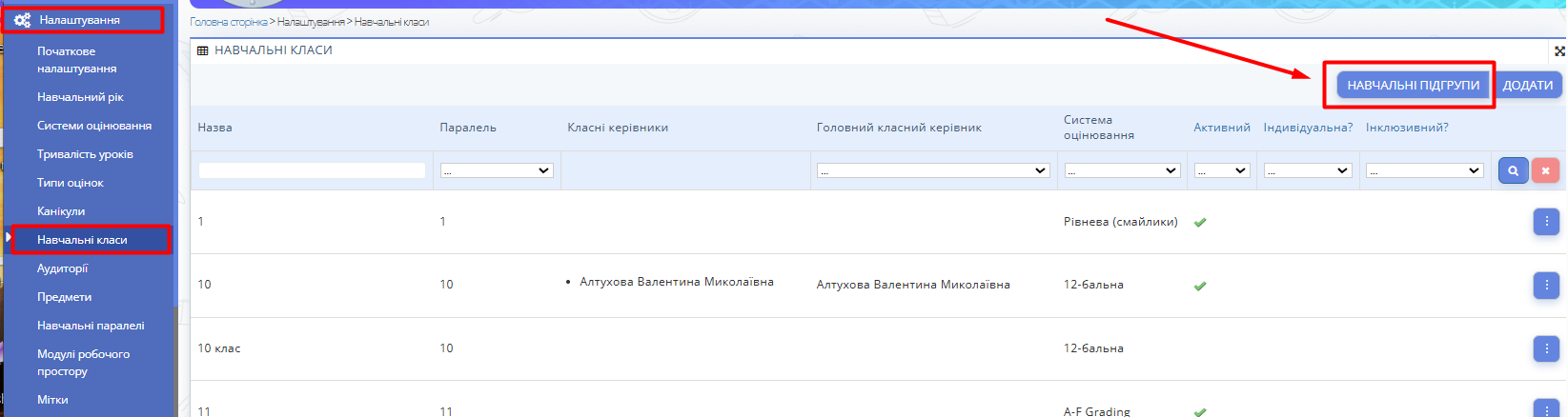- У правому верхньому кутку сторінки натисніть на "Навчальні підгрупи".