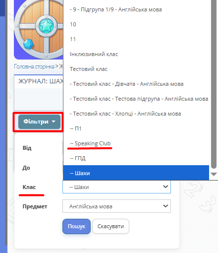Рис. 7 — Група у списку класів у фільтрі журналу