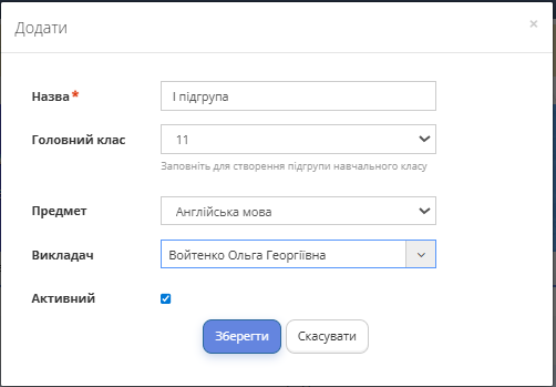 Рис. 2 — Кнопка "Додати" - У вікні, що відкрилося, введіть назву групи, головний клас, викладача, предмет і поставте галочку "Активний".
