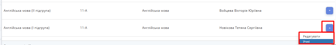 - Щоб відредагувати дані про підгрупу або додати до підгрупи учнів, натисніть на кнопку справа від назви підгрупи та оберіть "Редагувати" або "Учні".