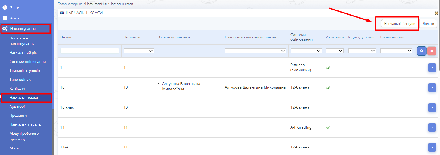 2. У правому верхньому кутку сторінки натисніть на "Навчальні підгрупи".