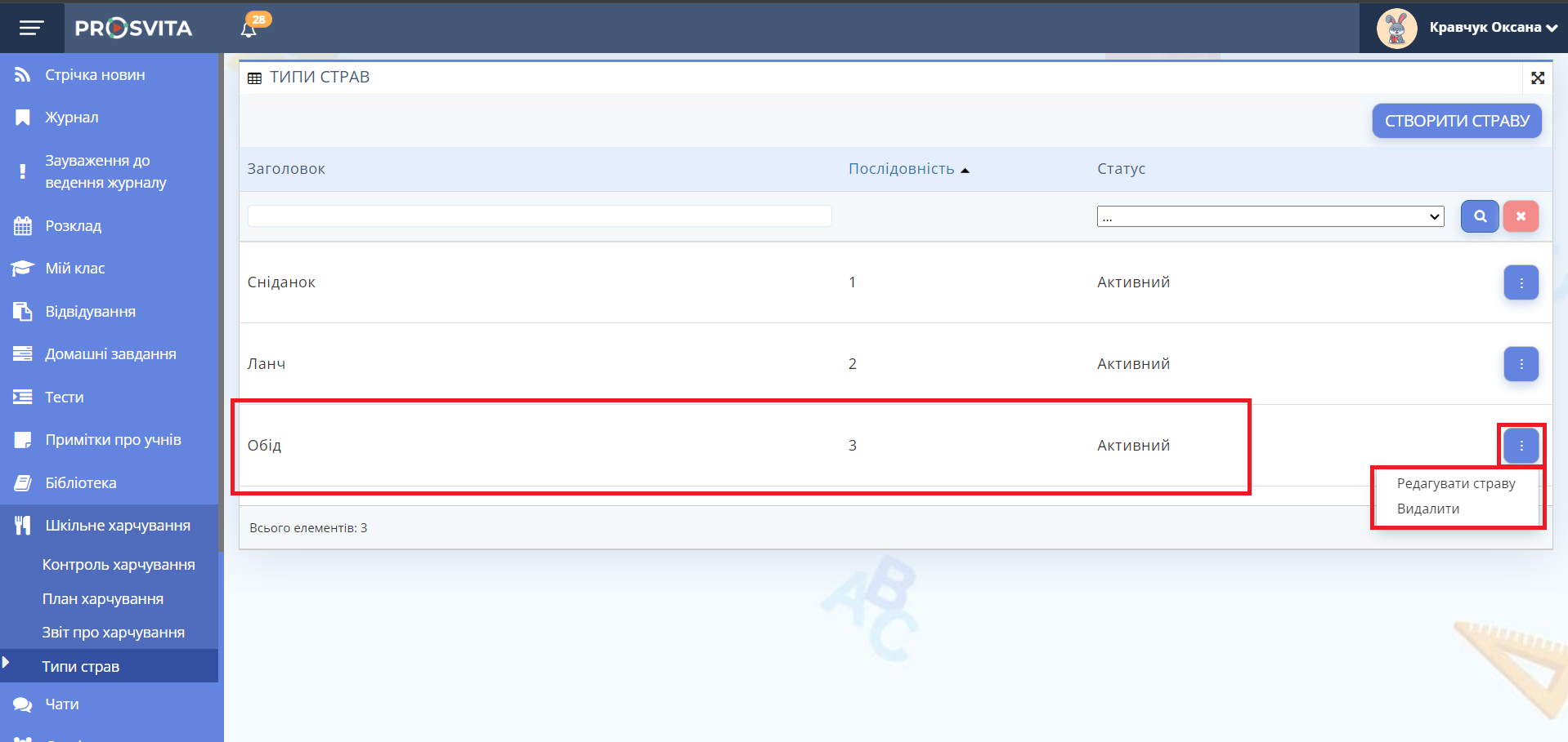 Щоб редагувати або видалити страву, натисніть кнопку з трьома крапками праворуч від назви.