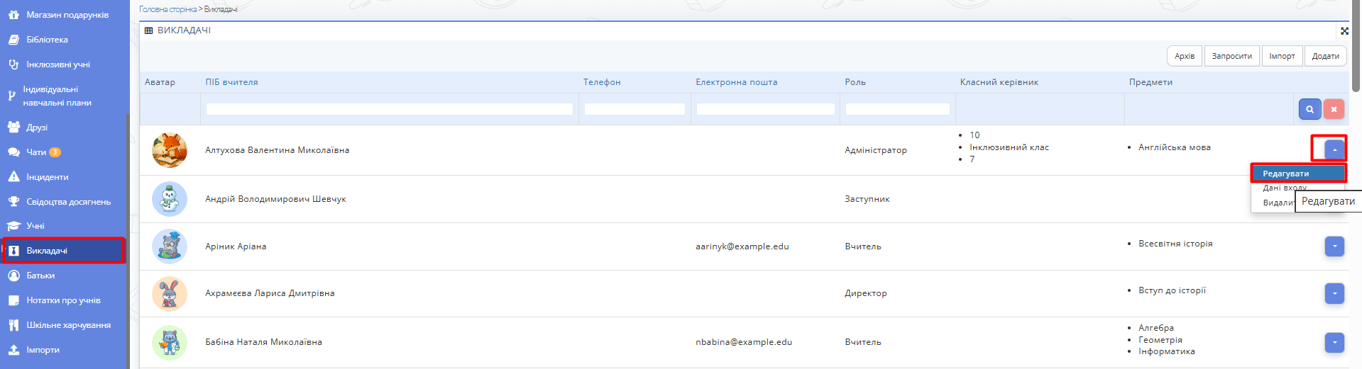 Рис. 1 — Розділ "Викладачі" - Оберіть потрібного представника персоналу школи, чию роль потрібно змінити (наприклад, назначити додаткового чи нового адміністратора, змінити директора/заступника та ін.).