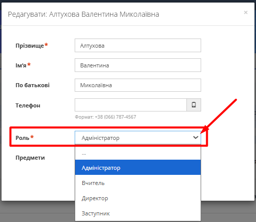 Рис. 2 — Редагування ролі персоналу на платформі - У полі "Роль" змініть на потрібну роль.