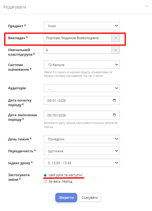 Рис. 2. Налаштування предмета - Оберіть опцію "Застосувати зміни: Цей урок та наступні".