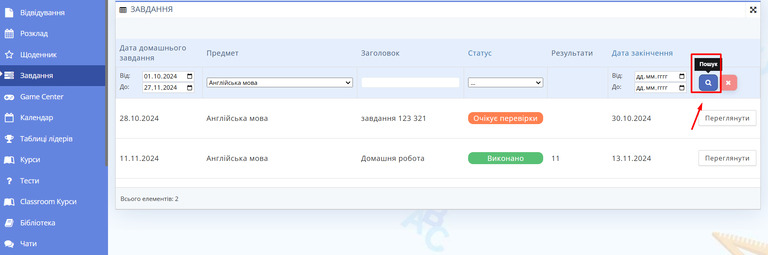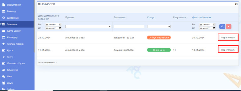 Рис. 2 — Список завдань - Якщо ви хочете розширити можливості пошуку, скористайтеся фільтрами у верхній частині сторінки. Ви можете вказати дату, коли завдання було задано, обрати конкретний предмет, знайти завдання за його змістом, вибрати статус виконання завдання або встановити дедлайн для завдання.